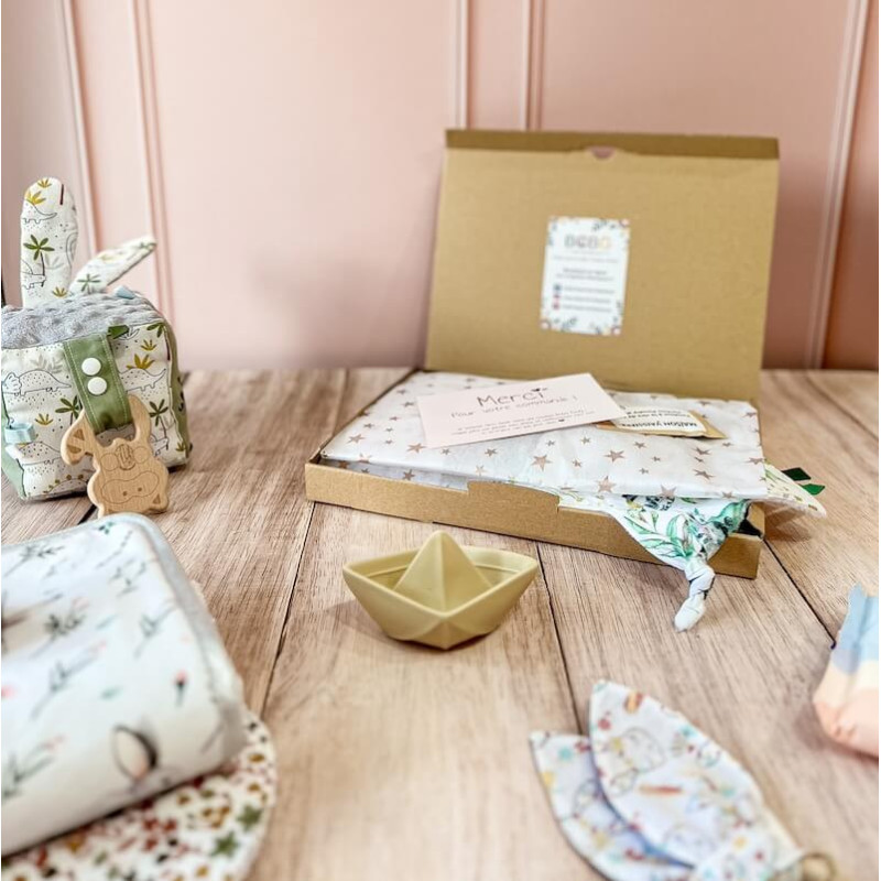 - Contenu du coffret naissance : Aléatoire selon les stocks (Accessoires d'éveil, de soin ou de repas).