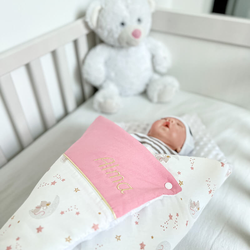 1 nid d'ange 70x70cm avec capuche : tissu safari inspiration toile de jouy rose : 67€.
